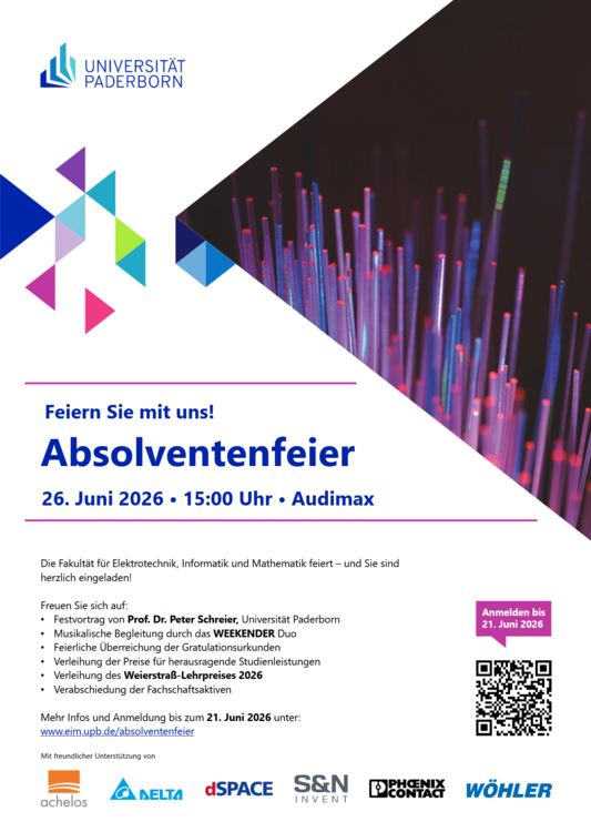 Willkommen zur Absolventenfeier 2026 der Fakultät für Elektrotechnik, Informatik und Mathematik an der Universität Paderborn! Wir laden alle Absolventinnen und Absolventen sowie deren Familien und Freunde ein, diesen bedeutenden Moment zu feiern. Am 26. Juni 2026 ab 15:00 Uhr wird die Feier im Audimax stattfinden. Verpassen Sie nicht die Gelegenheit, gemeinsam mit uns den erfolgreichen Abschluss dieses wichtigen Lebensabschnitts zu würdigen. Bitte melden Sie sich bis spätestens 21. Juni 2026 an, um Teil der Feier zu sein!